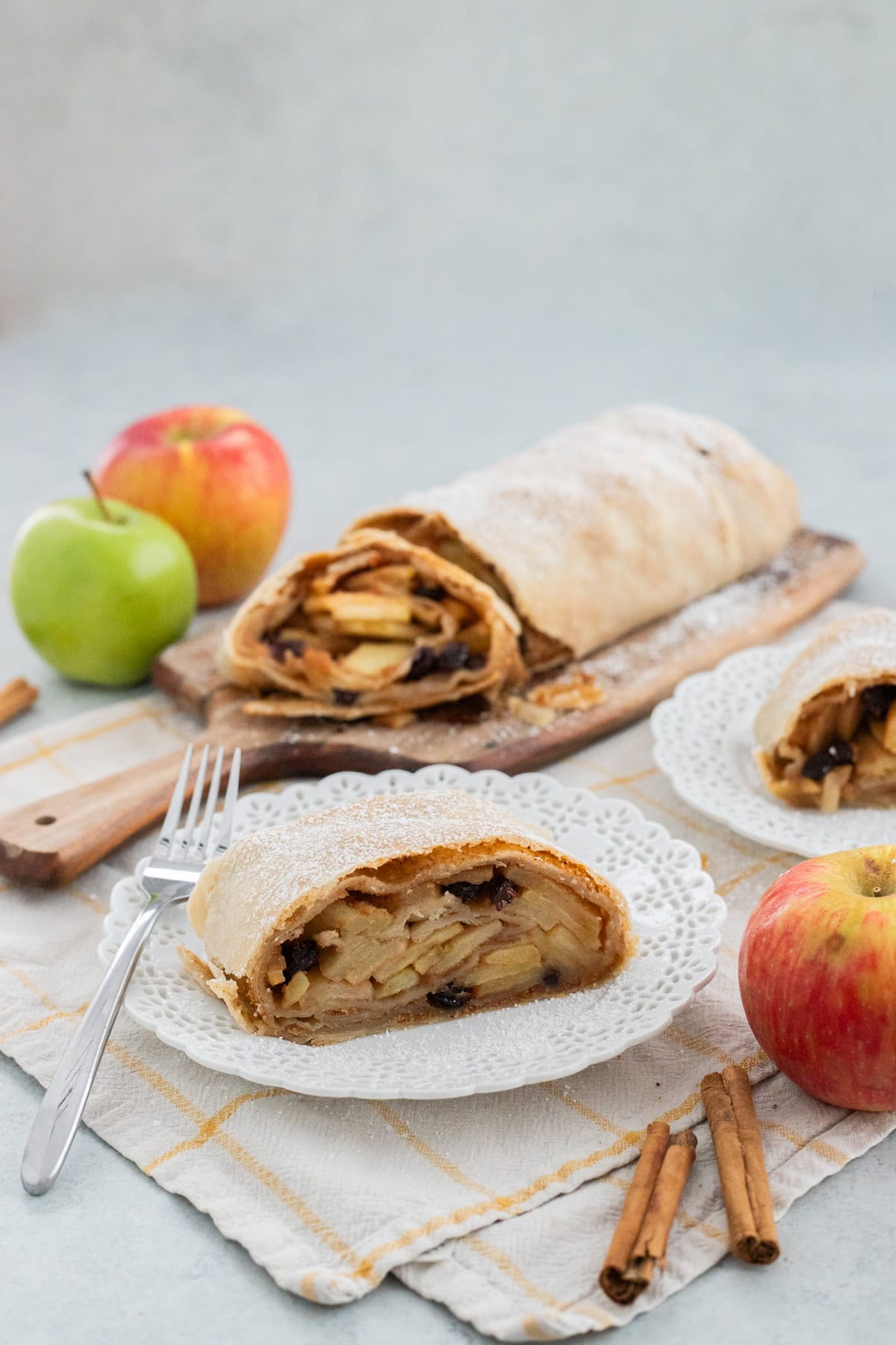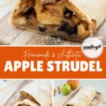There's nothing more cozy than the warm smell of this Apple Strudel Recipe filling your home! This classic dessert combines a homemade strudel dough wrapped around a sweet and spiced apple filling. Whether you serve it warm with powdered sugar and a drizzle of vanilla sauce, or with a scoop of vanilla ice cream, this apple strudel is a show-stopping treat that everyone will love!