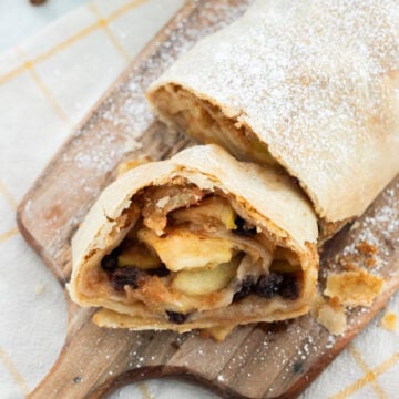 I've always had a soft spot for apple strudel, because it feels extra special being completely homemade. The dough is so simple to make, and I love how fun it is to stretch it out until it's paper-thin. For the filling, I like to use a mix of tart and sweet apples, cinnamon, and juicy raisins. And the best part is enjoying a warm slice fresh from the oven, dusted with powdered sugar, or served with whipped cream or ice cream.