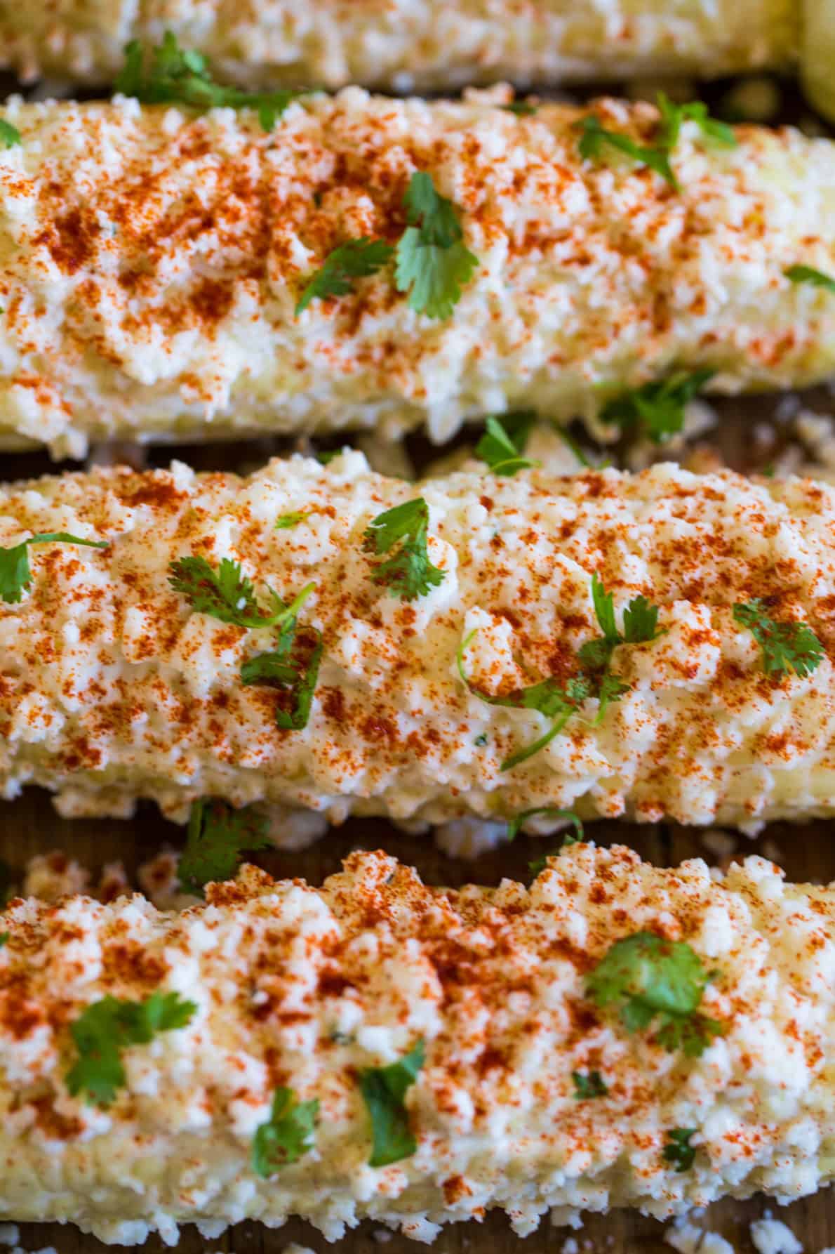 - Sprinkle the corn cobs with crumbled cojita cheese, smoked paprika, and chopped cilantro.