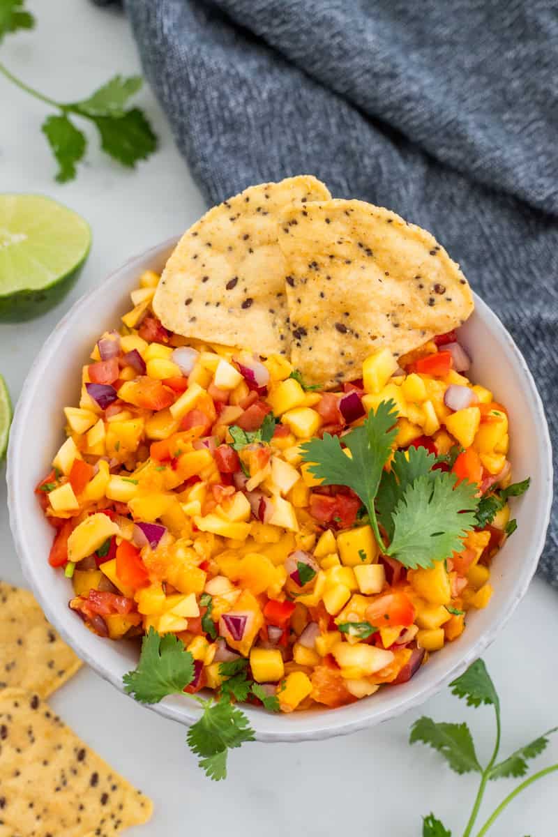 This fresh Peach Mango Salsa is the perfect way to use up all that fresh summer produce! Bright, colorful, and full of flavor, it's a show-stopping dip that's delicious served with tortilla chips, spooned onto tacos, or paired with grilled chicken or fish.