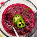 Tangy with just the right amount of spice, this Jalapeno Cranberry Sauce is a fun and unique twist on the classic holiday side! Tart cranberries are simmered with brown sugar, jalapeno, and lime to create a sauce that’s vibrant, bold, and perfect for adding a little more flavor to your Thanksgiving table. Plus, it's make ahead friendly and it only takes 15 minutes to make!
